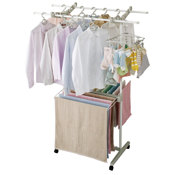 移動に便利なキャスター付きです!●商品サイズ(約):幅118.5×奥行70.5×高さ163cm ●収納時サイズ(約):幅72×奥行8×高さ137cm ●重量:3.8kg ●耐荷重:全体で8kg ●干す量の目安:シャツ等10枚、バスタオル4枚、タオル10枚、小物20枚 ●材質:塩化ビニル樹脂被覆鋼管、ポリプロピレン★