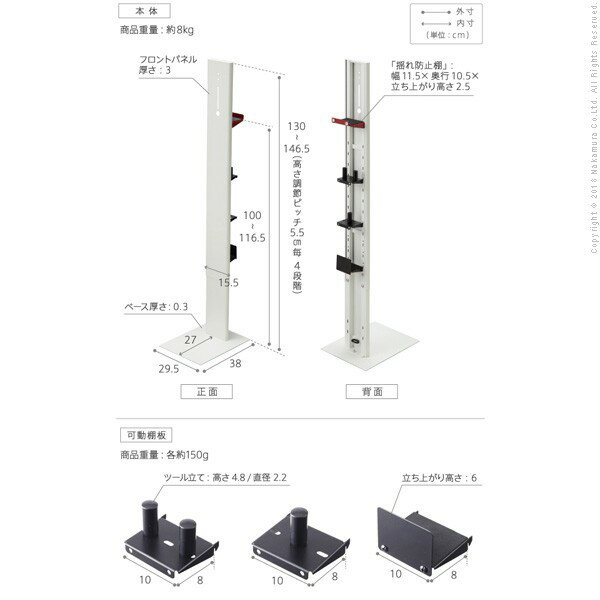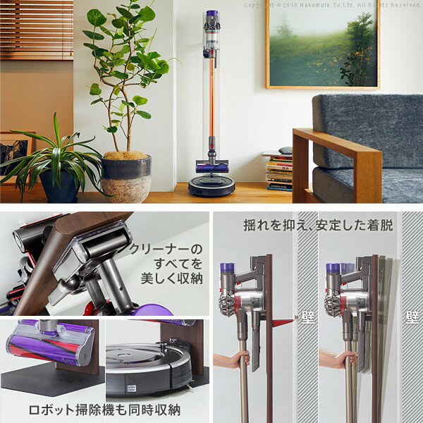【カラーバリエーション】 ■クリーナースタンド本体 サテンホワイト・サテンブラック・ウォールナット 【仕様】 本体・固定棚板:スチール 棚板・丸棒:スチール ◎組立品 【クリーナー対応機種】 Dyson:V10,V8,V7,V6,DC62,DC74,DC45,DC35 TOSHIBA[TORNEO V]:VC-CL1400/VC-CL400 Panasonic[iT]:MC-SBU510/MC-PBU510J SHARP[TREED]:EC-SX 【ロボット掃除機対応機種】 iRobot Roombaシリーズ Panasonic RULOシリーズ HITACHI minimaruシリーズ dyson360eye(サテンホワイトのみ収納可能) 【サイズ】 本体:幅29.5x奥行38x高さ130~146.5cm・約8kg フロントパネルサイズ:幅15.5x奥行3x高さ30~146.5cm ベース(有効):幅29.5x奥行38(27)cm・厚み3mm 揺れ防止棚サイズ:幅11.5x奥行10.5x立ち上がり高さ2.5cm 棚板1:幅10x奥行8cm/ツール立てx2本 棚板2:幅10x奥行8cm/ツール立てx1本 棚板3:幅10x奥行8cm/ツール支え高さ6cm 重量:各約150g 株式会社ナカムラ(I-3600179)